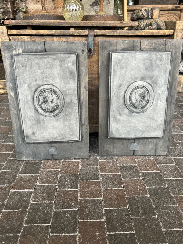 Set/2 beton wandborden met medaillonStoere set van 2 oldlook houten wandborden met betonnen medaillons V/M, per stuk afm 60x39 cm